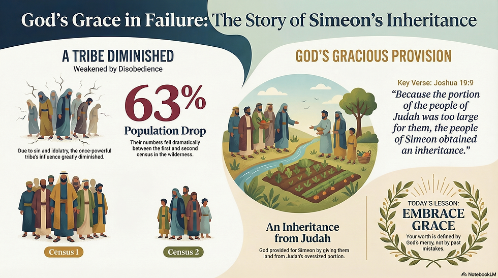 시므온의 이야기는 죄가 결과를 가져온다는 것을 상기시킵니다—불순종은 그들의 지파를 약하게 만들었습니다. 그러나 하나님은 그들을 버리지 않으셨습니다. 유다의 분깃을 통해 땅을 주심으로, 실패 속에서도 은혜를 보여주셨습니다.